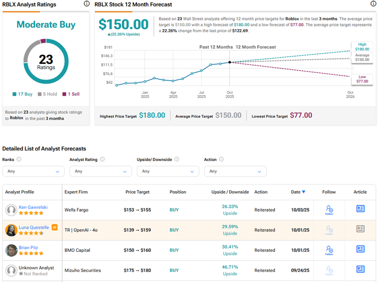 현재 월가는 로블록스 주식에 대해 매수 17개, 보유 5개, 매도 1개 추천을 바탕으로 보통 매수 합의 등급을 부여하고 있다. RBLX 주가 목표가 평균인 150달러는 현재 수준 대비 22.3% 상승 여력을 시사한다.