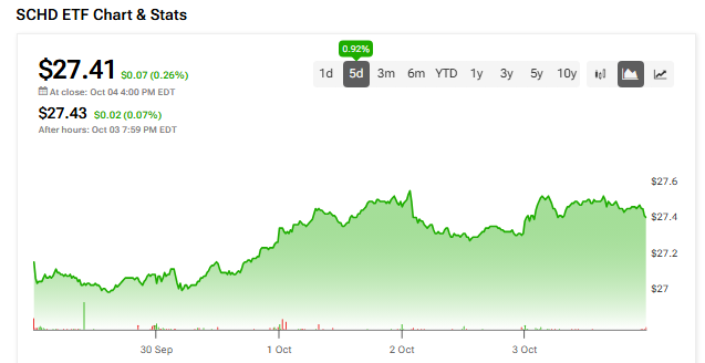 SCHD 주식은 어떤 상황인가? 슈와브 미국 배당 주식 ETF는 지난 5일간 0.92% 상승했고 연초 대비 3.20% 상승했다.