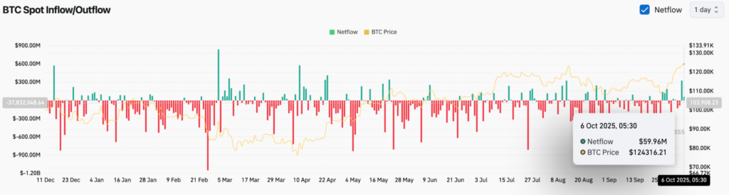 온체인 데이터도 모멘텀을 확인해주고 있다. 코인글래스 데이터에 따르면 비트코인은 오늘 5990만달러의 순유입을 기록했으며, 10월 5일 전날 유입량까지 합산하면 2일간 총 순유입액이 4억달러를 넘어섰다.