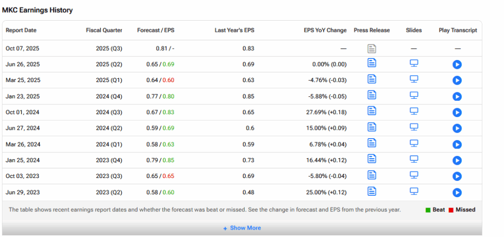 MKC가 이러한 전망치를 상회할 수 있을까? 아래에서 볼 수 있듯이, 최근 실적 서프라이즈 기록은 양호한 편이다.
