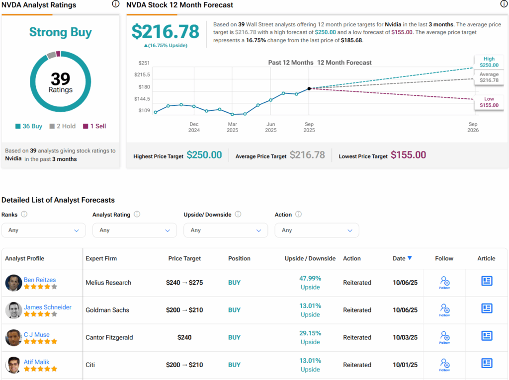 월가를 보면, 애널리스트들은 지난 3개월간 매수 36개, 보유 2개, 매도 1개의 의견을 바탕으로 NVDA 주식에 대해 강력 매수 합의 등급을 부여했다고 아래 그래픽이 보여준다. 또한 NVDA 평균 목표주가는 주당 216.78달러로 16.8%의 상승 여력을 시사한다.