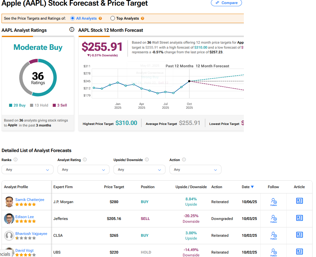 팁랭크스에서 AAPL은 매수 20개, 보유 13개, 매도 3개 등급을 바탕으로 보통매수 컨센서스를 받고 있다. 최고 목표주가는 310달러다. AAPL 주식의 컨센서스 목표주가는 255.91달러로 0.51% 하락 여력을 시사한다.