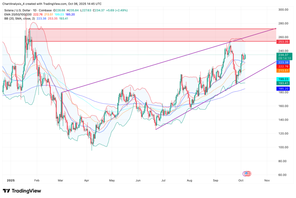 솔라나는 모든 주요 이동평균선 위에서 거래되고 있다. 20일 지수이동평균선 222달러와 50일 지수이동평균선 213달러가 직접 지지선으로 작용하고 있다.
