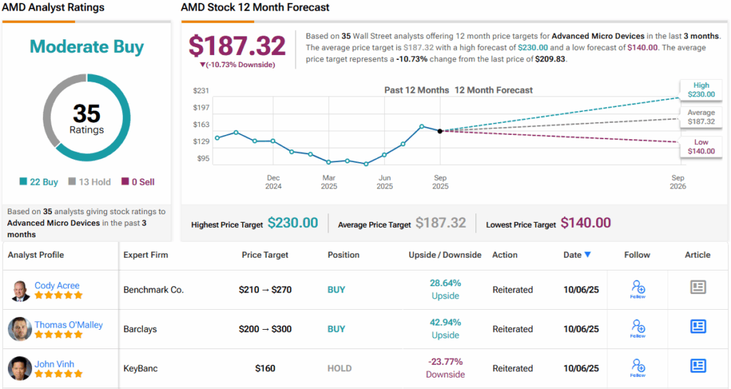 실제로 오말리는 추가 상승 여력이 있다고 보며, AMD 주식에 비중확대(매수) 등급을 부여하는 동시에 목표주가를 200달러에서 월가 최고치인 300달러로 상향 조정했다. 이는 현재 수준에서 43%의 추가 상승 가능성을 시사한다. (오말리의 실적 기록을 보려면 여기를 클릭)