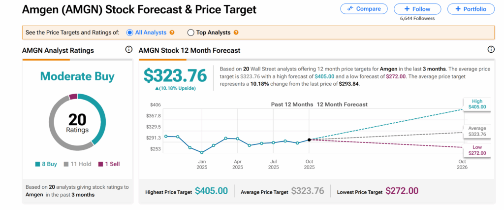 팁랭크스에서 암젠 주식은 현재 월가로부터 '보통 매수' 컨센서스 추천을 받고 있다. 이는 지난 3개월간 20명의 월가 애널리스트들이 매수 8개, 보유 11개, 매도 1개 의견을 제시한 결과다.