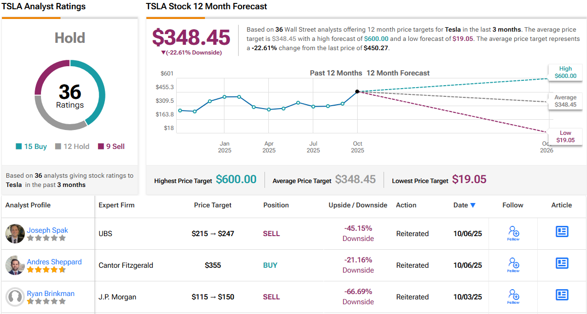 이는 특히 더 넓은 증권가 분위기와 비교할 때 확실히 강세적인 입장이다. 매수 15개, 보유 12개, 매도 9개의 혼재 속에서 테슬라는 보유(즉, 중립) 컨센서스 등급만을 받고 있다. 그리고 평균 목표주가 348.45달러로, 애널리스트들은 집단적으로 주식이 이미 그들이 생각하는 적정 수준을 약 23% 넘어섰다고 시사한다. (TSLA 주가 전망 참조)