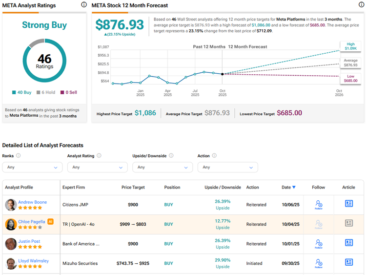 AI 호재를 고려할 때, 월가는 메타 플랫폼스 주식에 대해 40개 매수와 6개 보유를 바탕으로 강력한 매수 합의 등급을 부여했다. META 주식의 평균 목표주가 876.93달러는 현재 수준에서 23.2%의 상승 여력을 시사한다.