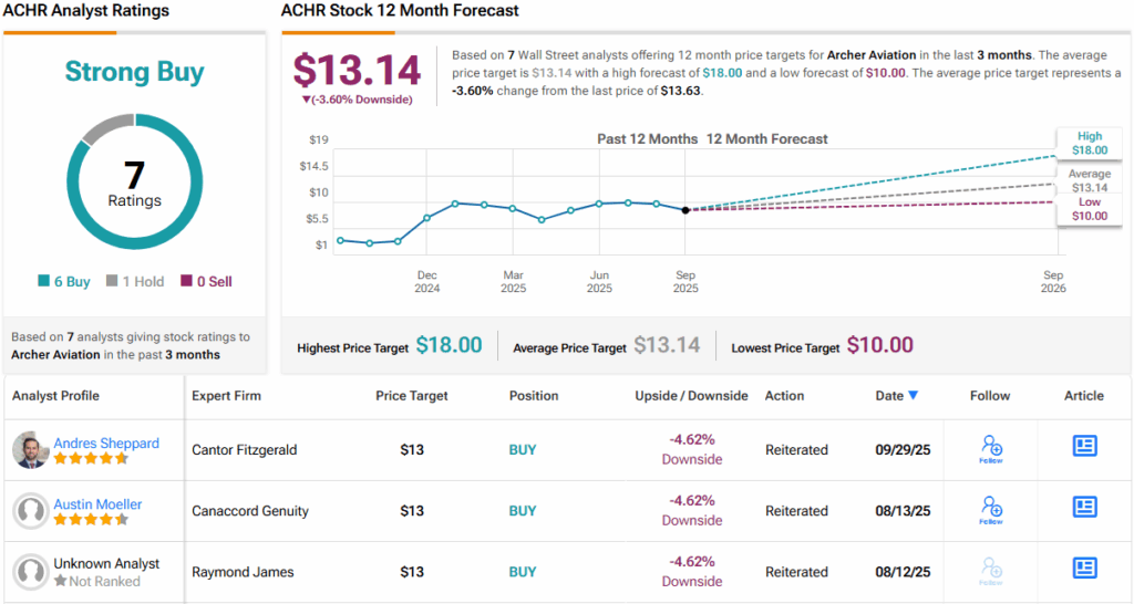 그렇다면 월가는 어떻게 생각하고 있을까? 현재 전망은 딜레마를 제시한다. 한편으로는 6개의 매수와 1개의 보유 의견을 바탕으로 ACHR 주식은 강력 매수 컨센서스 등급을 받고 있다. 하지만 올해 이렇게 높이 치솟은 후, 평균 목표주가는 향후 몇 달간 약 4%의 하락 여지를 시사한다. 애널리스트들이 곧 모델을 업데이트하거나 ACHR 등급을 변경할지 지켜보는 것이 흥미로울 것이다. (ACHR 주가 전망 참조)