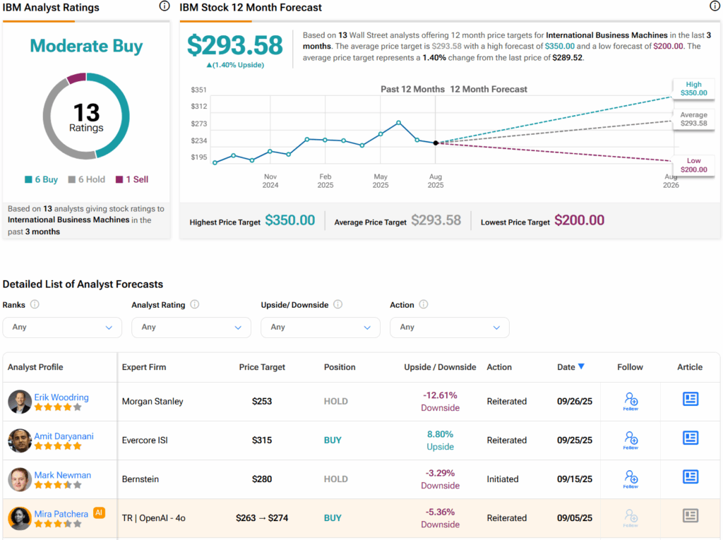 월가를 살펴보면, 애널리스트들은 지난 3개월간 매수 6개, 보유 6개, 매도 1개의 의견을 바탕으로 IBM 주식에 대해 보통 매수 합의 등급을 부여했다고 아래 그래프가 보여준다. 또한 IBM의 평균 목표주가는 주당 293.58달러로 1.4%의 상승 여력을 시사한다.