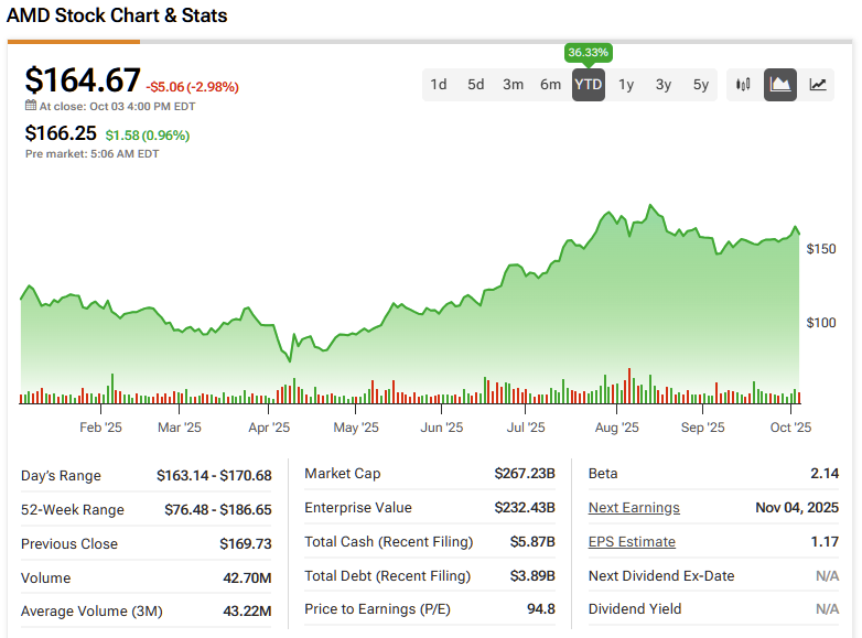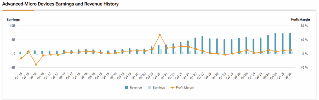 전반적으로 AMD가 걷고 있는 궤적이 마음에 든다. 더 강력한 데이터센터 믹스, 견고한 MI350 모멘텀, 중량급 파트너십, 그리고 제조 및 패키징에서의 의미 있는 진전이 있다. 하지만 주식은 이미 그런 낙관론의 상당 부분을 반영하고 있으며, 올해 수익의 약 43배에 거래되고 있고, 어떤 '정상화'든 내년 실행에 달려 있다. 이렇게 민감한 시장에서는 약간의 가이던스 하향 조정만으로도 AMD의 배수가 압축될 수 있다.