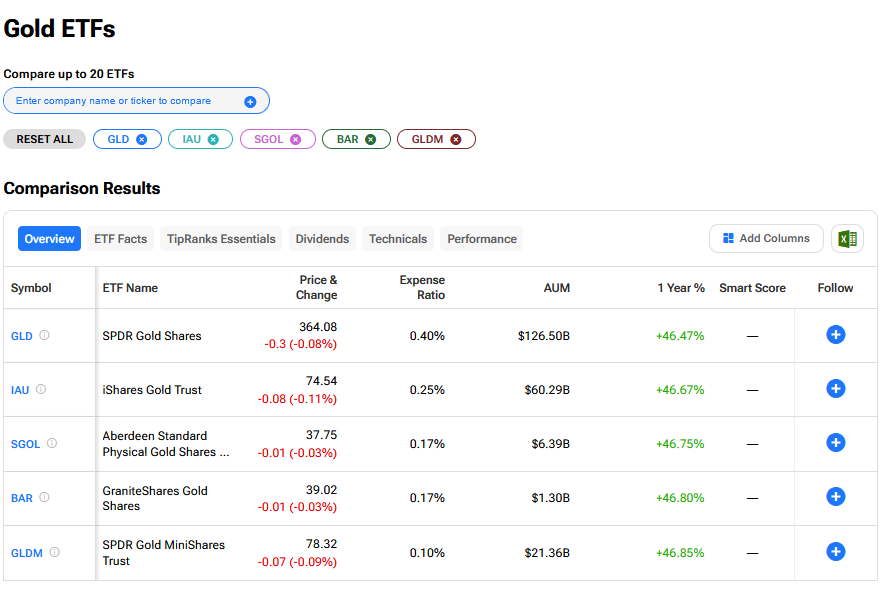 우리는 팁랭크스 비교 도구를 사용해 지금 매수할 최고의 금 ETF들을 정리했다.