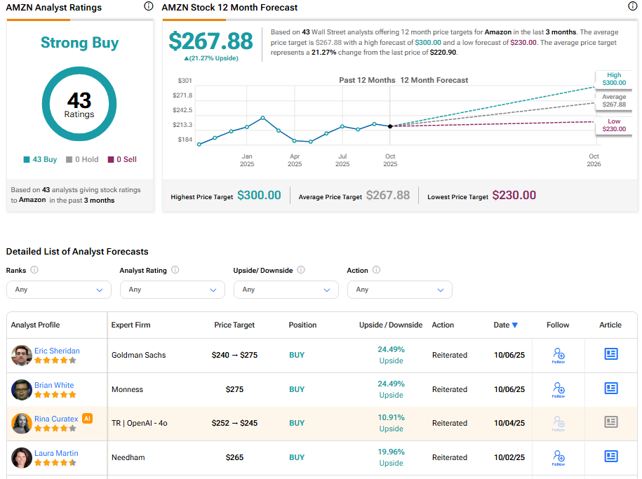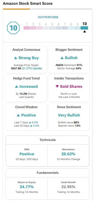 최고 점수는 애널리스트 지지, 헤지펀드 매수, 긍정적인 뉴스와 블로거 심리, 그리고 AMZN 주식에 대한 긍정적인 기술적 신호를 반영한다. 애널리스트들은 추가 상승 여력을 보고 있으며, 평균 목표주가는 267.88달러로 현재 수준에서 약 21.27%의 잠재적 상승 여력을 시사한다.