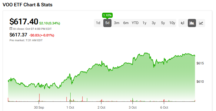 VOO 주식은 어떤 상황인가? 뱅가드 S&P 500 ETF는 지난 5일간 1.10% 상승했고 연초 대비 15.27% 올랐다.
