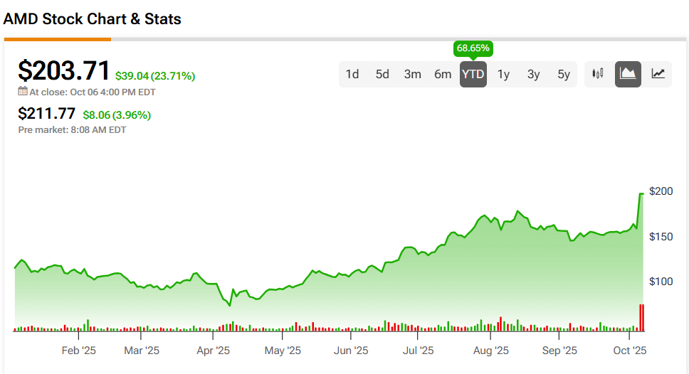 AMD 주가는 화요일 장전 거래에서 3.96% 상승했으며, 전날 23.71% 급등한 데 이어서다. 주가는 연초 대비 68.65%, 지난 12개월간 17.89% 상승했다. AI 붐이 2025년 AMD 주가 상승의 주요 동력이다.