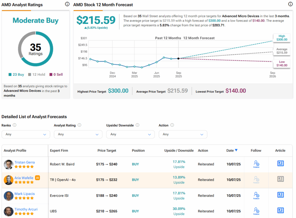 월가를 보면, 지난 3개월간 23개 매수와 12개 보유 등급을 바탕으로 한 AMD에 대한 애널리스트들의 합의 등급은 '보통 매수'다. 이와 함께 AMD 주식의 평균 목표주가는 215.59달러로, 주가의 잠재적 상승 여력은 5.83%다. AMD와 오픈ai 간 계약과 함께 더 많은 애널리스트 업데이트가 예상된다.