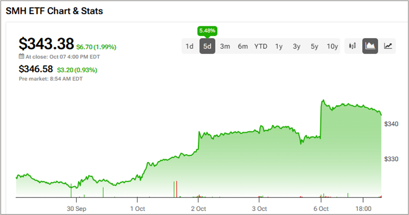 SMH 주가는 어떻게 움직이고 있을까? 밴에크 반도체 ETF는 지난 5일간 5.5% 상승했으며, 연초 대비 39% 올랐다.