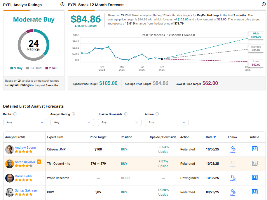 월가로 눈을 돌리면, PYPL 주식은 지난 3개월간 9개 매수, 13개 보유, 2개 매도 의견을 바탕으로 보통 매수 컨센서스 등급을 받고 있다. 84.86달러인 페이팔 평균 목표주가는 15.01%의 상승 여력을 시사한다.