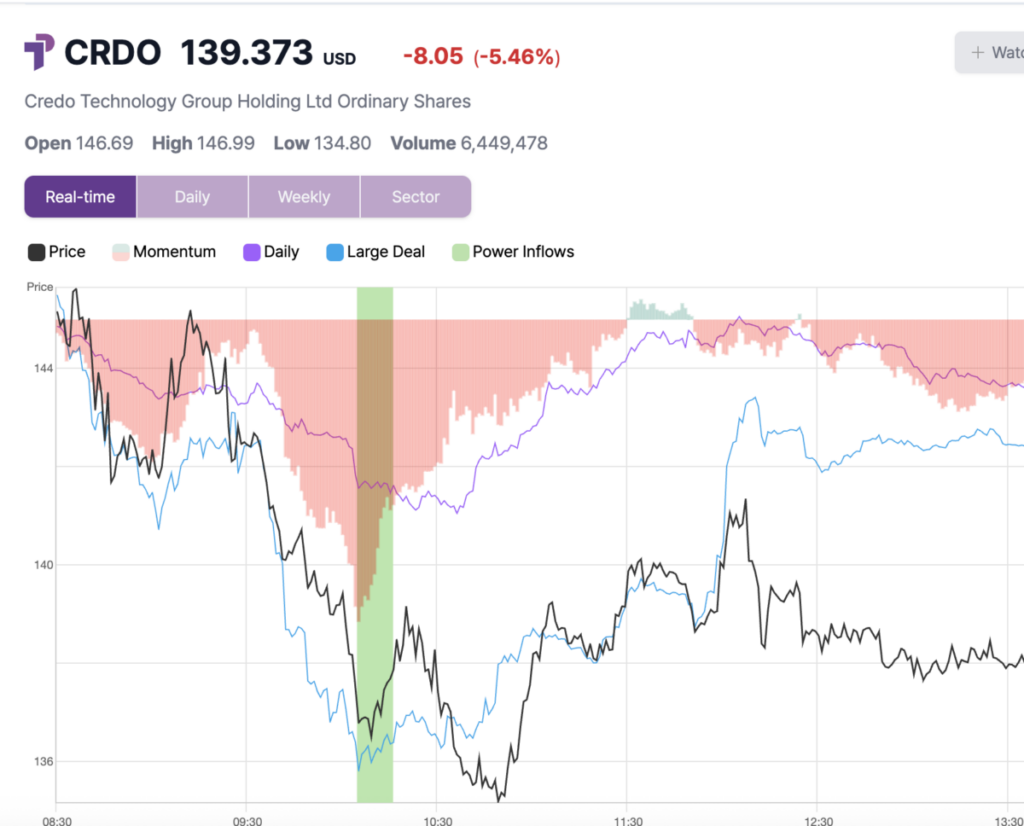 크레도테크놀로지그룹홀딩(NASDAQ:CRDO)이 주문흐름 분석에서 강력한 매수세 유입 신호를 보였다. 이는 기관과 개인의 주문흐름 데이터를 중시하는 트레이더들이 주목하는 강력한 매수 신호다.