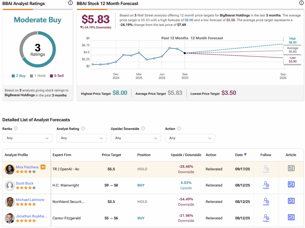 월가로 눈을 돌리면, BBAI 주식은 2개의 매수, 1개의 보유, 0개의 매도 등급을 바탕으로 보통 매수 합의 등급을 받고 있다. BBAI 주식의 평균 목표가는 5.83달러로, 향후 12개월 동안 약 24%의 하락 위험을 시사한다.