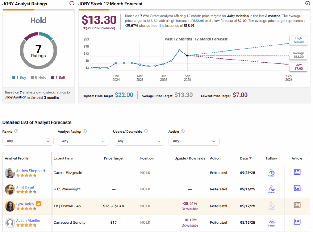 월가로 눈을 돌리면, JOBY 주식은 매수 1개, 보유 5개, 매도 1개 등급을 바탕으로 보유 컨센서스 등급을 받고 있다. JOBY 평균 목표주가는 13.30달러로, 향후 1년간 거의 30%의 하락 위험을 시사한다.