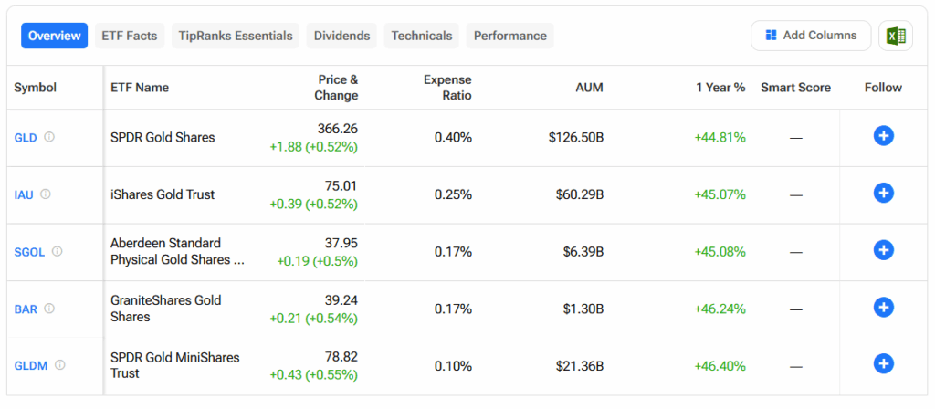 팁랭크스의 ETF 비교 차트에서 볼 수 있듯이 금 ETF들이 올해 뛰어난 성과를 보였다. 경쟁이 치열하지만 아래 표시된 금 ETF 중에서 GLDM, SPDR 골드 미니셰어스 트러스트가 가장 큰 상승률을 기록했다.