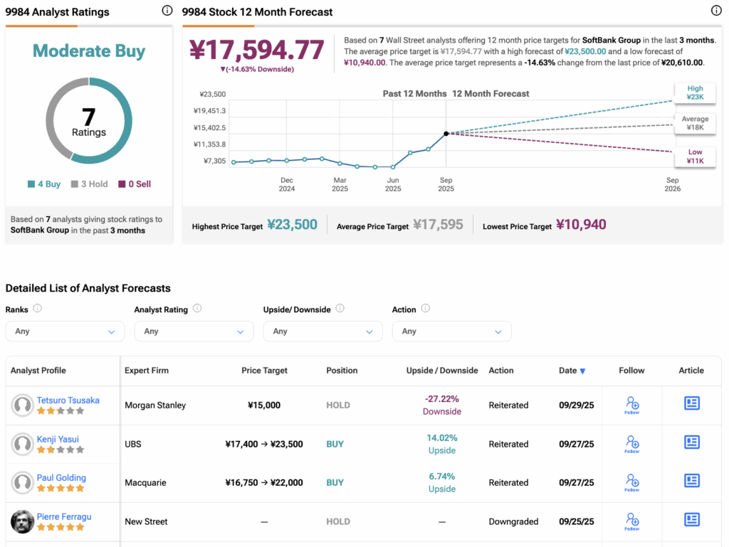 팁랭크스에 따르면 9984 주식은 지난 3개월간 매수 4개, 보유 3개 의견을 바탕으로 보통매수 컨센서스 등급을 받았다. 1만7594.7엔에서 소프트뱅크의 목표주가는 현재 거래 수준 대비 14.63% 하락 여력을 시사한다.