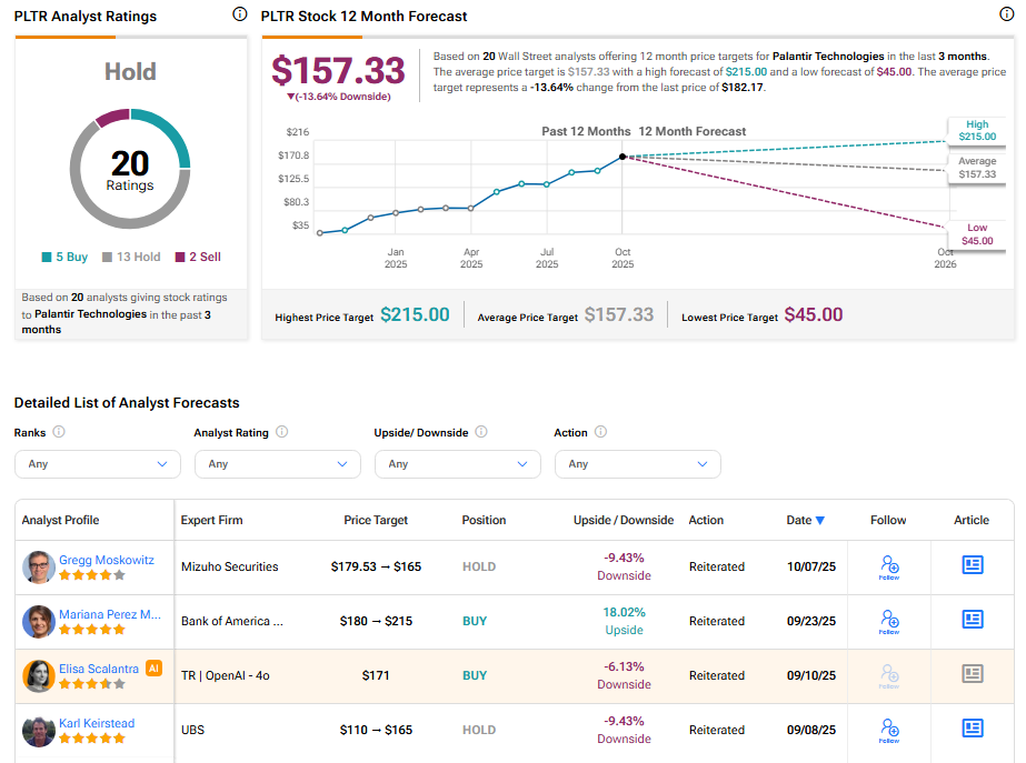 팰런티어 테크놀로지스 (PLTR)는 올해 AI 소프트웨어 분야에서 가장 주목받는 기업 중 하나였다. 주가는 지난 1년간 339% 이상 급등했고 최근 3개월간 30% 상승했다. AI 기반 제품과 서비스에 대한 강력한 수요가 상승을 견인했다. 하지만 미즈호 증권의 그렉 모스코위츠 애널리스트는 이런 기대감이 이미 주가에 충분히 반영됐다고 본다. 4성급 애널리스트인 그는 새 보고서에서 주당 165달러의 목표주가와 함께 중립 등급을 재확인했다. 이는 현재 수준 대비 9% 하락 여력을 시사한다.