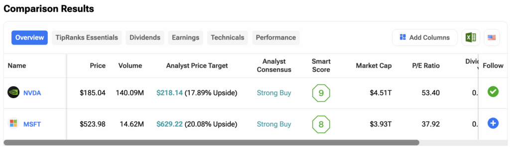 투자자들은 팁랭크스 주식 비교 도구를 사용해 다양한 애널리스트 등급과 재무 지표로 엔비디아와 마이크로소프트 주식을 나란히 비교할 수 있다. 아래 이미지를 클릭해 도구를 살펴보자.
