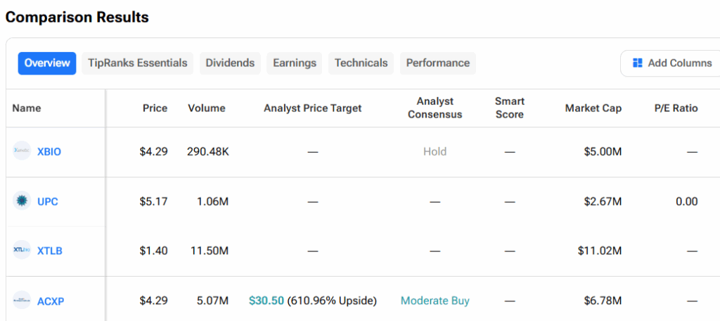 팁랭크스 주식 비교 도구를 보면 제네틱 바이오사이언시스와 아큐알엑스 파마슈티컬스만이 상당한 애널리스트 관심을 받고 있다. 제네틱 바이오사이언시스는 목표주가 없이 컨센서스 보유 등급을 받고 있다. 아큐알엑스 파마슈티컬스는 평균 목표주가 30.50달러로 컨센서스 적정매수 등급을 받고 있어 610.96%의 상승 여력을 시사한다.