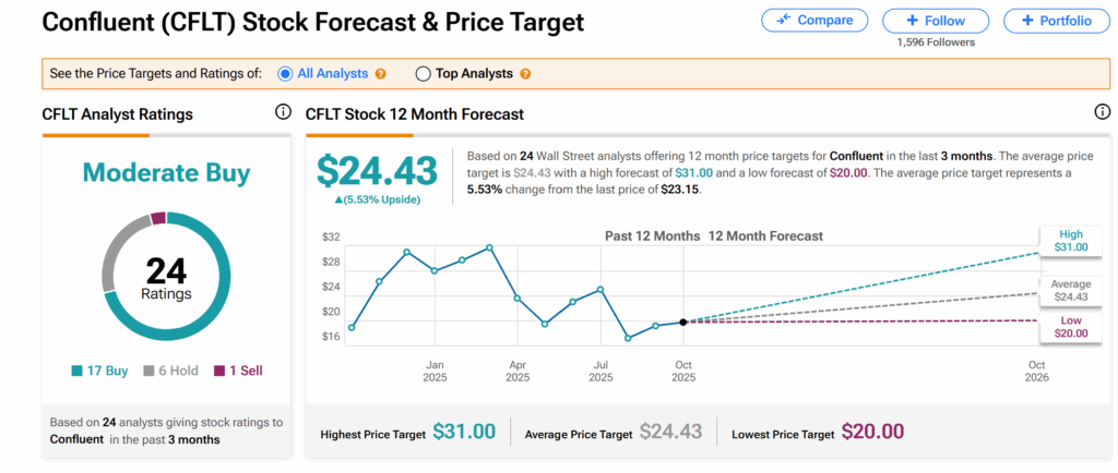 하지만 월가에서 컨플루언트 주식은 현재 보통매수 컨센서스 추천을 받고 있다. 이는 지난 3개월 동안 24명의 월가 애널리스트들이 매수 17개, 보유 6개, 매도 1개를 부여한 것에 기반한다.