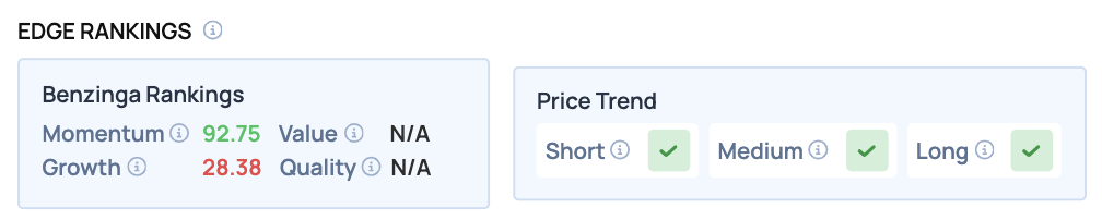 벤징가 엣지 순위에 따르면 이 주식은 92.75의 강력한 모멘텀 점수를 기록했다. 사모투자 발표의 모멘텀이 수요일 거래까지 이어진 것으로 보인다.