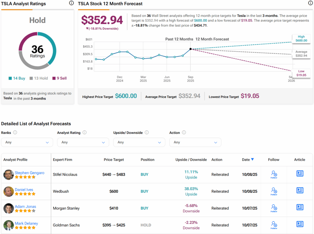 일론 머스크의 회사들 대부분은 비상장 기업이다. 하지만 개인투자자들은 그의 가장 인기 있는 회사인 테슬라 (TSLA)에 투자할 수 있다. 월가를 보면 애널리스트들은 지난 3개월간 매수 14개, 보유 13개, 매도 9개의 의견을 바탕으로 TSLA 주식에 대해 보유 컨센서스 등급을 매겼다. 또한 주당 352.94달러의 평균 TSLA 목표주가는 18.6%의 하락 위험을 시사한다.