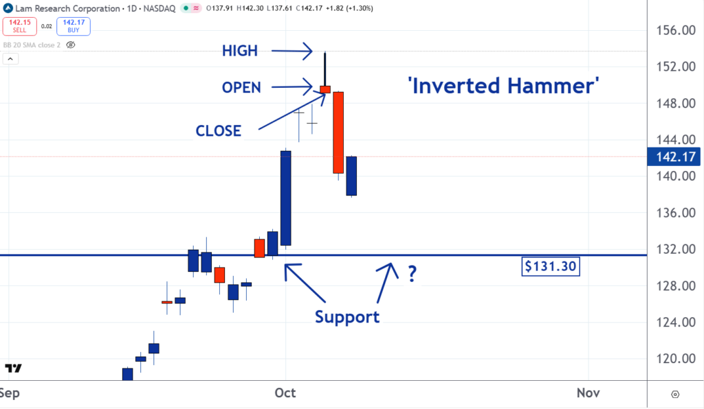 때로는 하루 만에 주도권 변화가 일어나기도 한다. 분석가들은 이를 반전일이라고 부른다. 램리서치 차트에 나타난 '역햄머' 패턴은 월요일에 매도 세력이 우세해졌음을 보여준다.