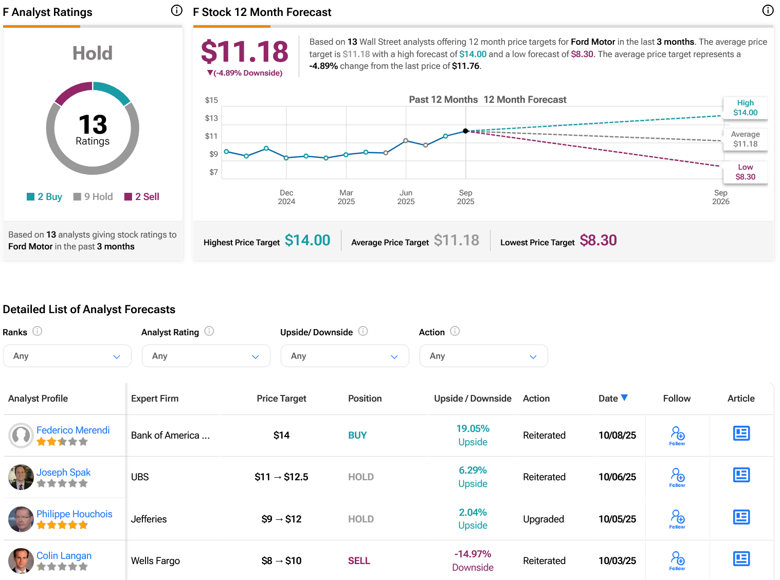 월가를 보면, 애널리스트들은 아래 그래픽에서 보는 바와 같이 지난 3개월 동안 매수 2개, 보유 9개, 매도 2개가 부여된 것을 바탕으로 F 주식에 대해 보유 컨센서스 등급을 갖고 있다. 지난 1년 동안 주가가 12.24% 상승한 후, 주당 11.18달러의 평균 F 목표주가는 4.89%의 하락 위험을 시사한다.