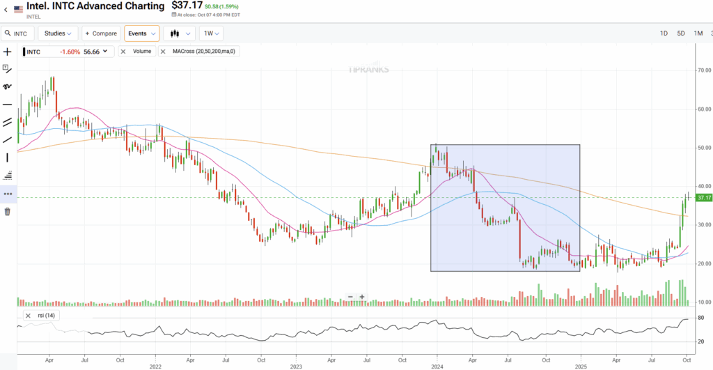 인텔 주가는 올해 들어 약 85% 상승했다. 2024년 내내 사방에서 타격을 받으며 60% 하락했던 회사에 대해 이런 말을 할 수 있다는 것은 놀라운 일이다. 하지만 1년이면 이렇게 달라질 수 있다. 미국 정부가 상당한 지분 매입에 합의하고, 엔비디아가 50억 달러 투자를 약속하고, 소프트뱅크가 20억 달러를 투입하고, 최근에는 AMD가 인텔 파운드리 이용을 검토하고 있다는 보도까지 나오는 등 고액 자본 유입과 헤드라인을 장식하는 개발 소식들이 쏟아졌다.