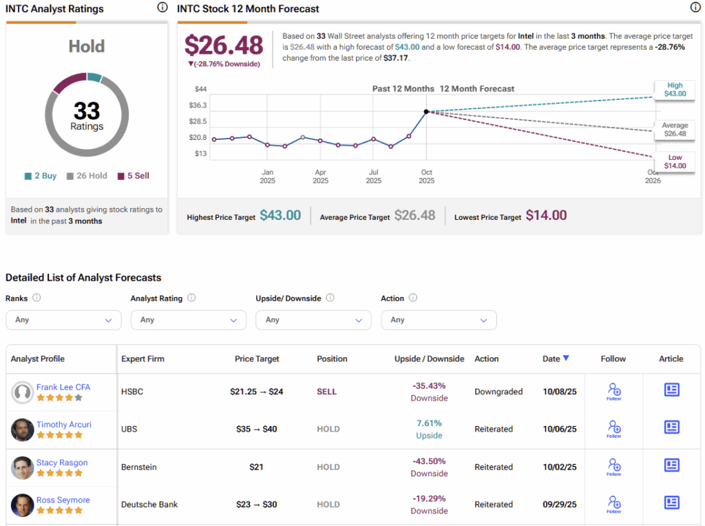 이 주식은 현재 매수 2개, 보유 26개, 매도 5개 등급을 바탕으로 보유 컨센서스 등급을 받고 있다. 주목할 점은 인텔의 평균 목표주가 26.48달러가 현재 수준에서 약 28% 하락 여지를 시사한다는 것으로, 대부분의 애널리스트들이 주가가 펀더멘털을 앞서갔다고 보고 있음을 보여준다.