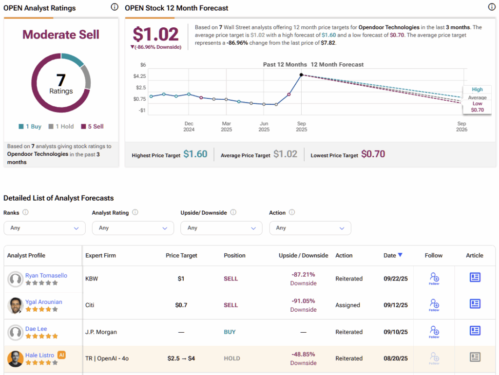 간단히 답하면 아니다. 월가에서 OPEN 주식은 지난 3개월간 매수 1개, 보유 1개, 매도 5개 의견을 바탕으로 보통 매도 컨센서스 등급을 받고 있다. OPEN의 평균 목표주가 1.02달러는 향후 12개월간 87%라는 엄청난 하락 가능성을 시사한다.
