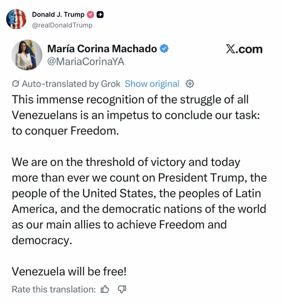 마차도는 수상 후 트럼프에게 감사를 표했다.
