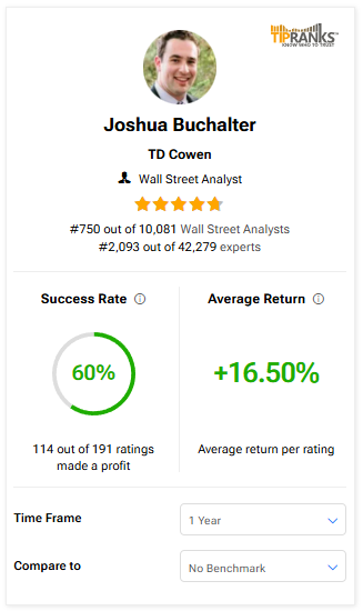 흥미롭게도 부찰터는 TipRanks의 1만 명 이상의 애널리스트 중 750위에 랭크되어 있다. 그는 60%의 성공률과 등급당 평균 16.5%의 수익률을 기록하고 있다.