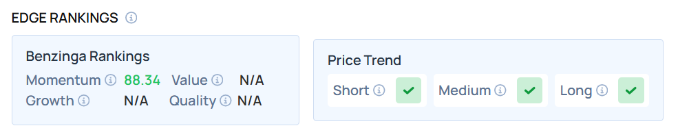 벤징가의 자체 엣지 랭킹에 따르면 IBIT의 모멘텀 지수는 100점 만점에 88.34점으로 가장 강세를 보이고 있다.