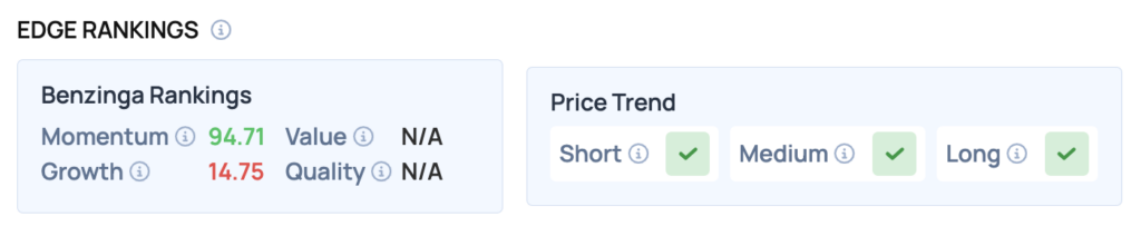 벤징가 엣지 순위에 따르면 플러그파워는 94.71점의 매우 높은 모멘텀 점수를 기록하고 있다.