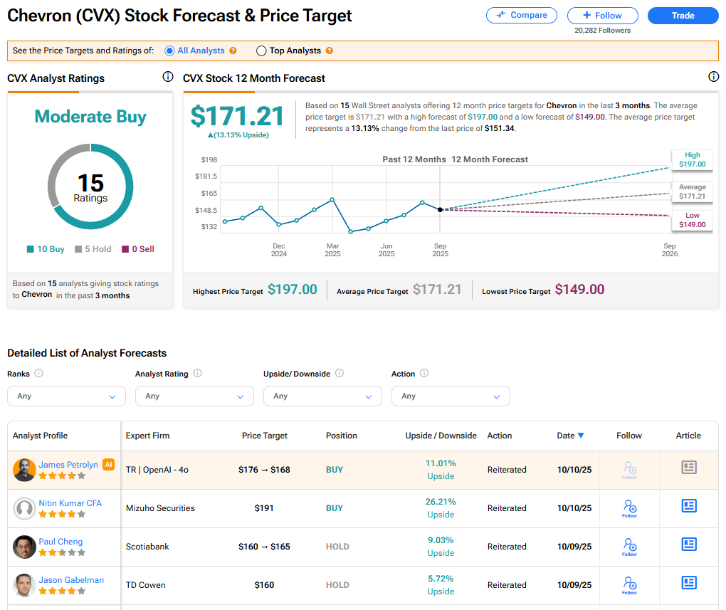 셰브론 주식은 월가 애널리스트 15명 사이에서 보통매수 등급의 합의를 얻고 있다. 이 등급은 지난 3개월간 발표된 매수 10개와 보유 5개 추천에 기반한다. CVX 평균 목표주가 171.21달러는 현재 수준에서 13.13% 상승 여력을 시사한다.