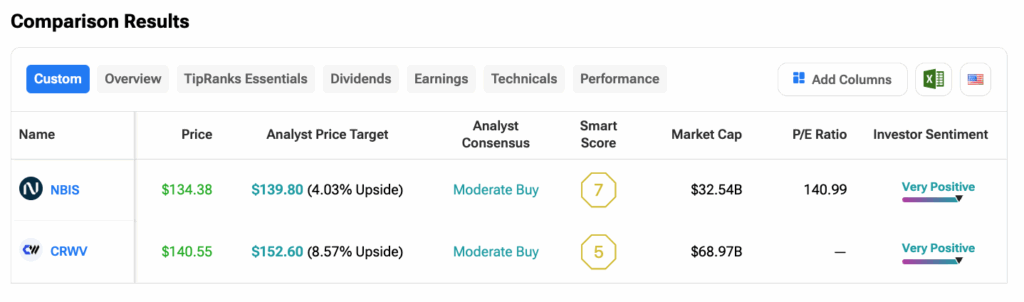 팁랭크스 주식 비교 도구를 사용해 NBIS와 CRWV를 비교한 결과, 애널리스트들이 어떤 AI 주식을 선호하는지 확인했다. CRWV와 NBIS 모두 애널리스트들로부터 보통매수 등급을 받았다. 152.60달러인 코어위브 평균 목표주가는 현재 수준에서 8% 이상의 상승 여력을 시사한다. 이에 비해 NBIS의 목표주가는 139.80달러로 3.7%의 보다 완만한 상승 여력을 나타낸다.