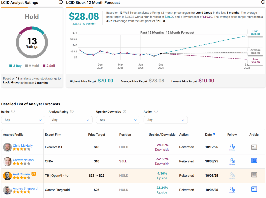 월가를 살펴보면, 애널리스트들은 지난 3개월간 매수 2개, 보유 9개, 매도 2개의 의견을 바탕으로 LCID 주식에 대해 보유 컨센서스 등급을 부여했다고 아래 그래프가 보여준다. 또한 LCID의 평균 목표주가는 주당 28.08달러로 33.2%의 상승 여력을 시사한다.