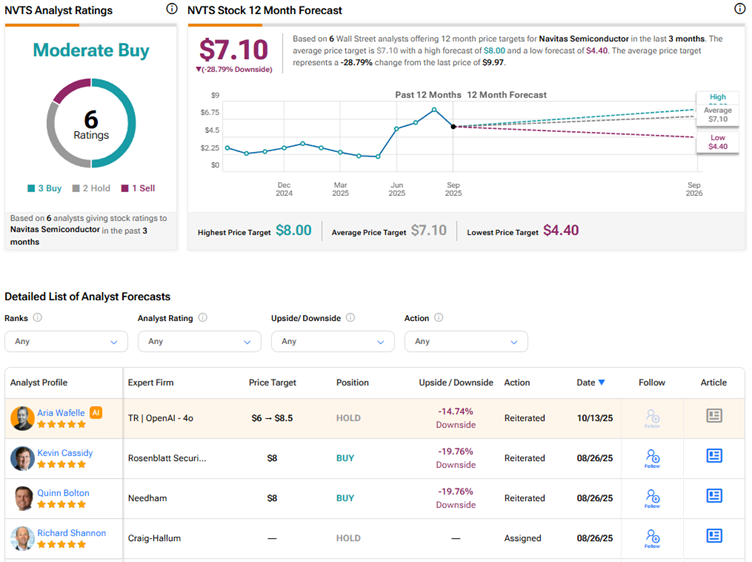 현재 월가는 나비타스 반도체 주식에 대해 매수 3개, 보유 2개, 매도 1개 추천을 바탕으로 보통 매수 합의 등급을 부여하고 있다. NVTS 주가 목표가 평균 7.10달러는 현재 수준에서 약 29%의 하락 위험을 시사한다. 월요일 종가 기준으로 NVTS 주가는 인상적인 179% 상승했다.