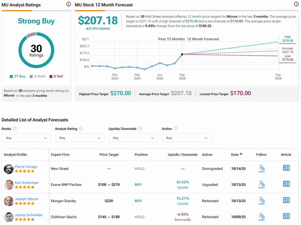 페라구만이 최근 마이크론 주식에 대해 의견을 제시한 애널리스트는 아니다. 엑산 BNP 파리바의 애널리스트 칼 애커만은 어제 이 주식을 목표주가 270달러로 매수 등급으로 상향 조정했다. 이는 42.22%의 상승 여력을 의미한다. 동시에 모건스탠리의 톱 애널리스트 조셉 무어는 목표주가 220달러로 매수 등급을 재확인했다. 이는 주식에 대해 15.88%의 상승 여력을 나타낸다.