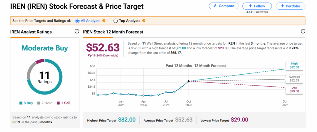 월가 전반에서 IREN 주식에 대한 낙관론은 훨씬 신중하며, 팁랭크스에서 볼 수 있듯이 해당 주식은 보통매수 합의 등급을 유지하고 있다. 이는 지난 3개월 동안 11명의 월가 애널리스트가 매수 8개, 보유 2개, 매도 1개 등급을 부여한 것에 기반한다.