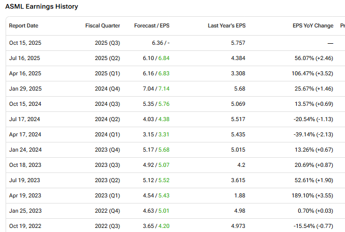 ASML이 이러한 추정치를 넘어설 수 있을까? 아래 그래프에서 보듯이 이 회사는 예상보다 나은 실적을 발표한 매우 강력한 실적을 보유하고 있다.