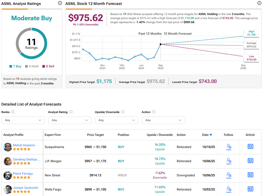 팁랭크스에서 ASML 주식은 7개의 매수와 4개의 보유 등급을 바탕으로 보통매수 합의 등급을 받고 있다. ASML의 평균 목표주가 975.62달러는 현재 수준에서 1.4%의 하락 위험을 시사한다.