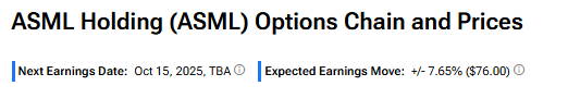 옵션 거래자들은 ASML 홀딩 (ASML)이 수요일 발표 예정인 3분기 실적 발표 후 시가총액이 7600만 달러 규모로 변동할 가능성에 대비하고 있다. 옵션 가격을 기준으로 거래자들은 ASML 주가가 실적 발표 후 양방향으로 약 7.65% 움직일 것으로 예상하고 있다.